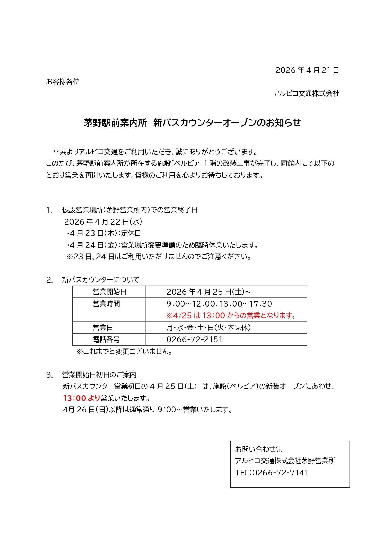 【アルピコ交通】茅野駅前案内所 新バスカウンターオープンのお知らせ