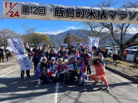 11月24日に飯島町で行われた第12回米俵マラソンにアルピコ保険リース、アルピコ自工、取引先の有志14名でお揃いのアルピコのTシャツ、法被を羽織り、アルピコ旗を振りながら参加しました。